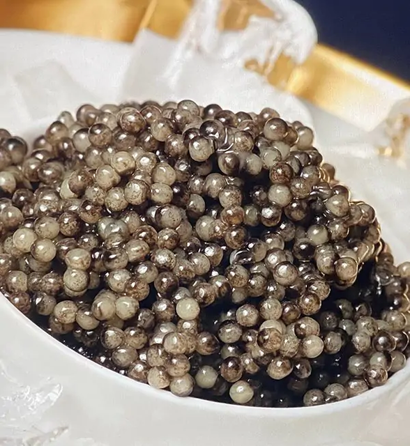 •щільні блискучі розсипчасті ікринки темно-сірого кольору.