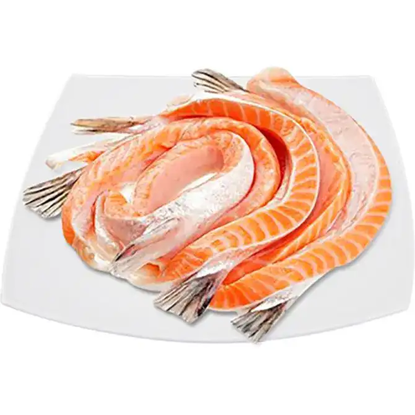 Свіжоморожені черевця лосося товщиною 1-3 см. Шокова заморозка без льоду. Висококалорійний поживний делікатес. Не містить консервантів.